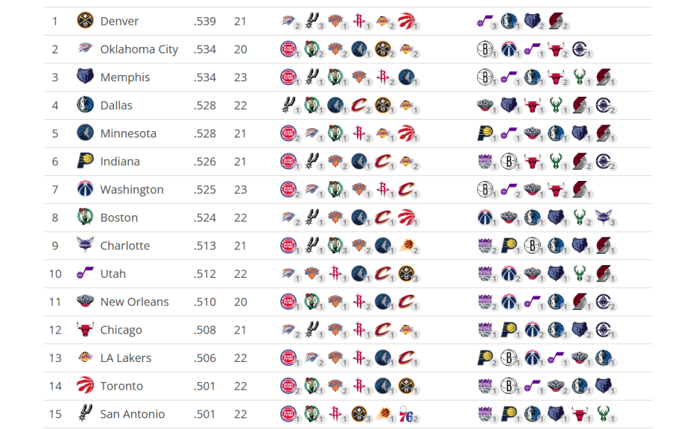11-15名:灰熊(23胜36负)、独行侠(21胜39负)、鹈鹕(19胜43负)、爵士(18胜42负)、国王(14胜48负)